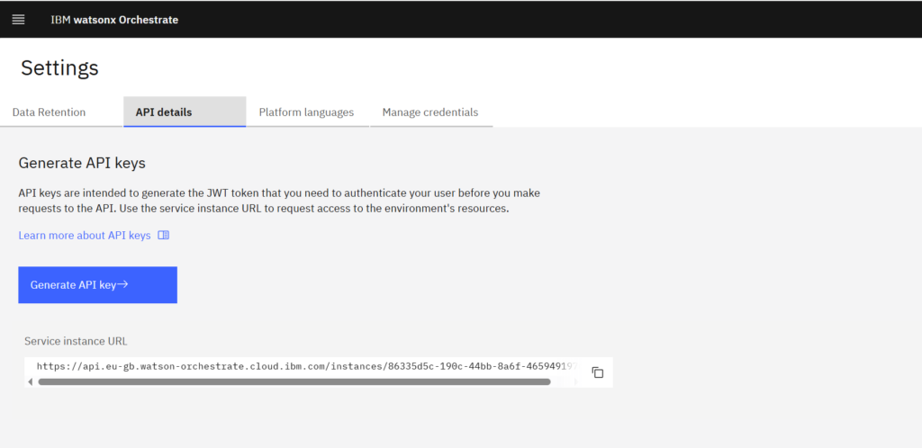 Go to „API details“ and copy the Service instance URL